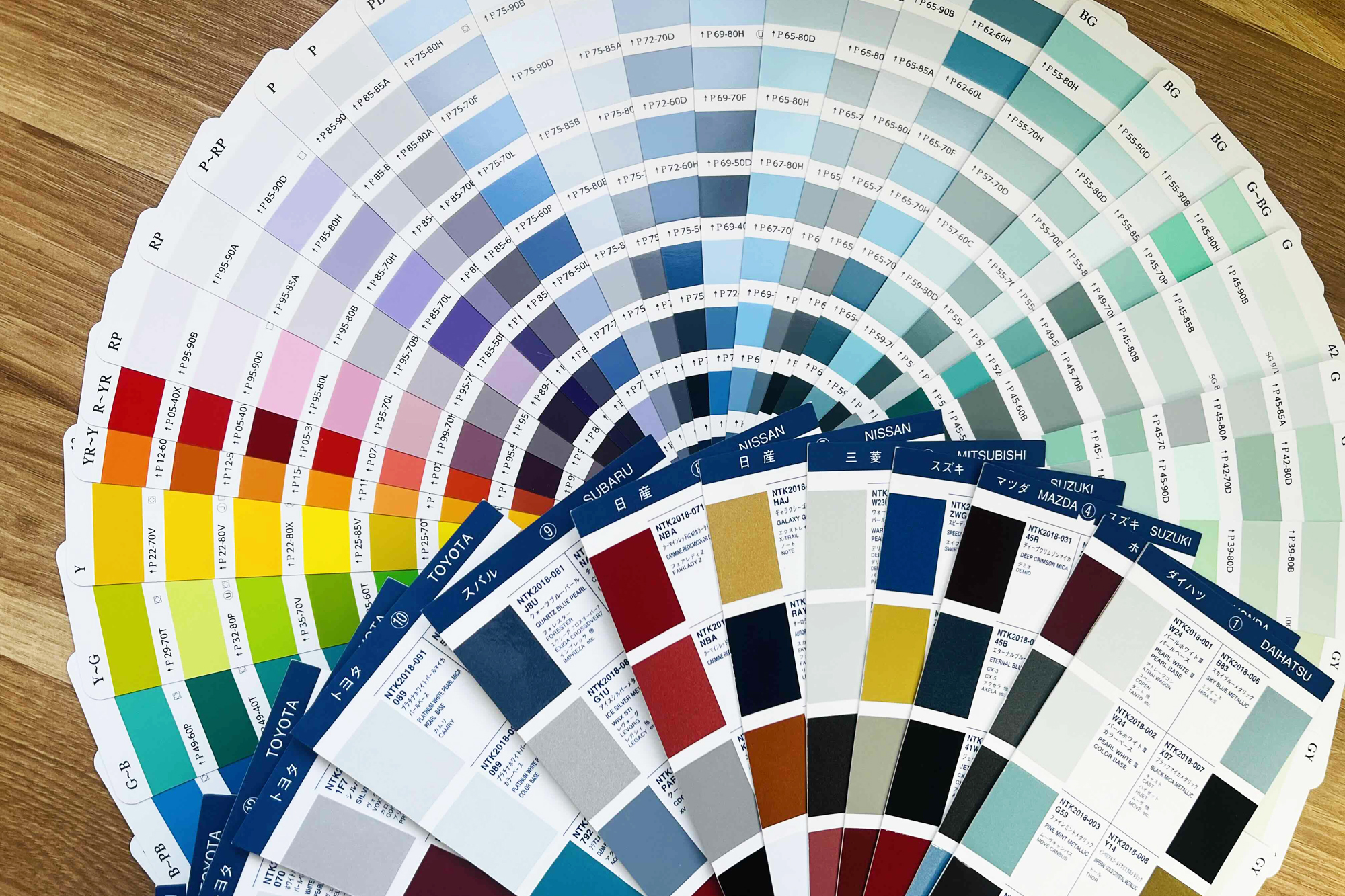 日塗工やマンセル値、車のカラー番号より社内調色しております。